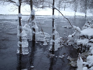 Nature's got talent! These formations are from Mörtfors today. The water is receding, but the ice remains on tree trunks and twigs.